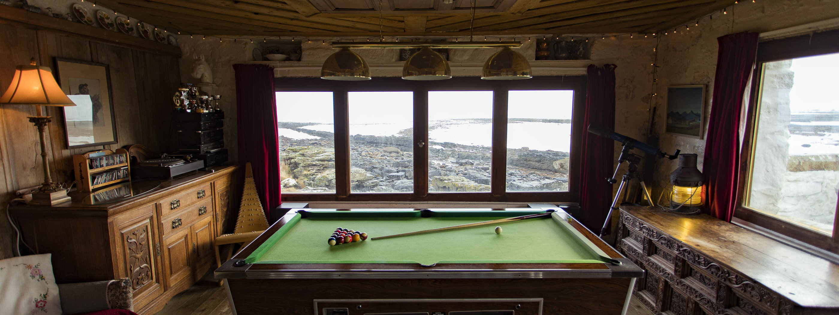 - Large lounge with open fire, pool table, flat screen Freesat TV, dvd player with a selection of DVDs, music system including cd layer and MP3/iPod dock, telescope, binoculars, sofa bed