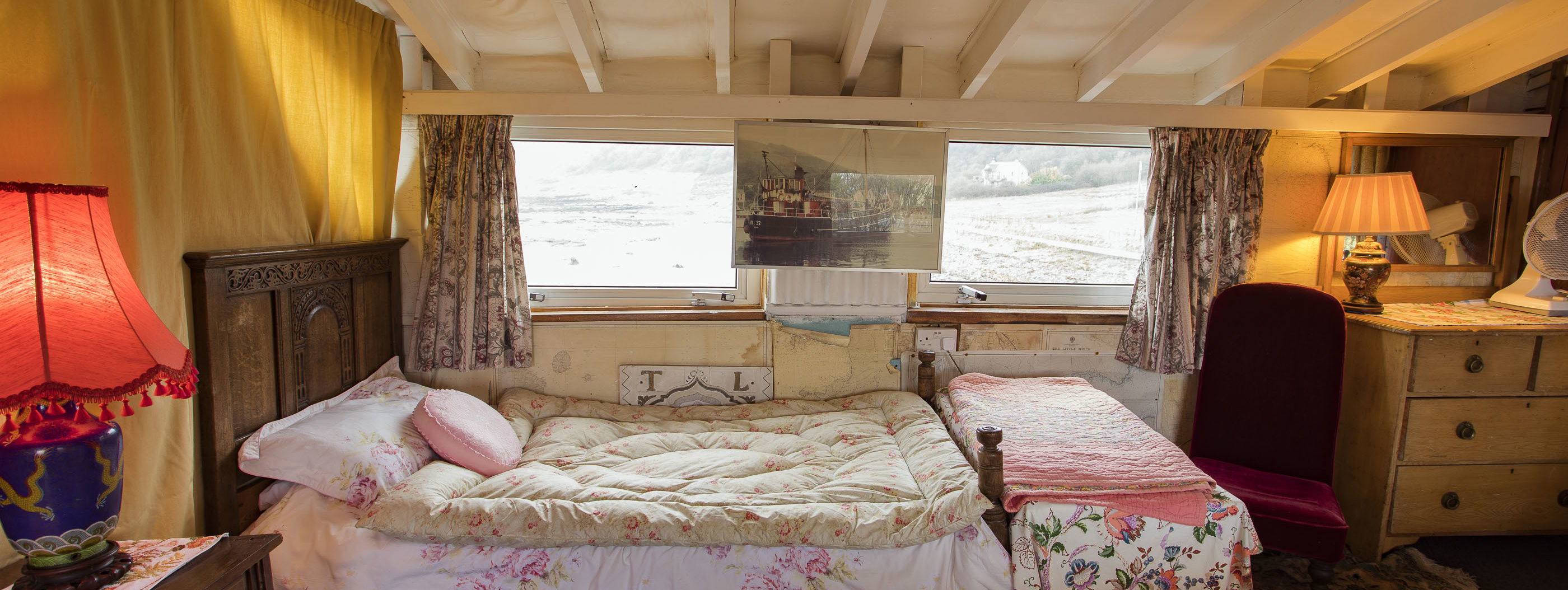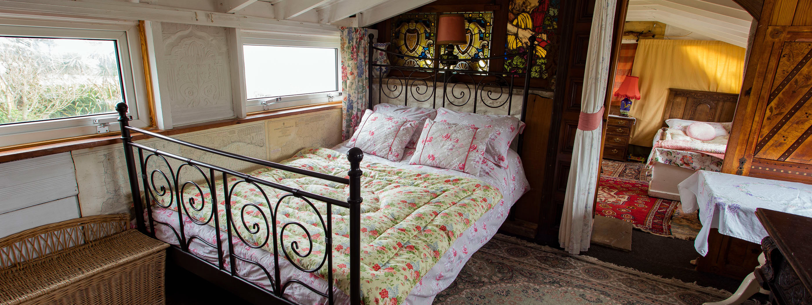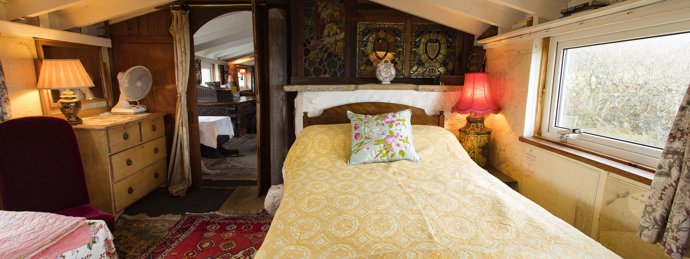 - One double bedroom and one twin bedroom containing a small double and single bed. Please note that these sleeping areas are not entirely separate. They are divided by a stained glass partition and curtain. Please bear this is mind when considering the needs of your party.